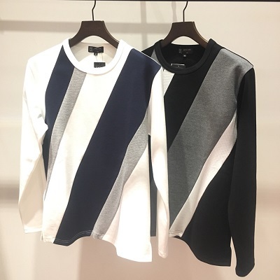 今季は2種類の素材がアクセントになりトレンドのバイヤス柄を用いることにより鮮度でインパクトのあるカットソーを提案!!