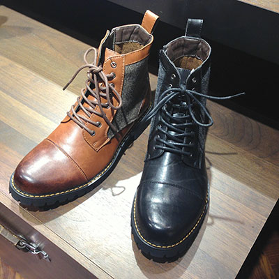 レザー調の素材とウール調のヘリンボン柄との素材をコンビネートしたブーツ。つま先部分にビンテージ加工を施し、立体感のあるデザインが特徴です。